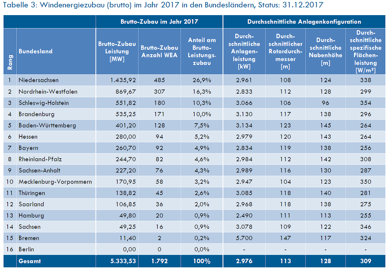 Nach dem Spitzenplatz in 2016 landet Niedersachsen beim Zubau auch in 2017 wieder auf Rang eins im Ländervergleich. Das ergibt der Statusreport 2017 der Deutschen Windguard GmbH in Varel, die seit 2012 in Nachfolge des Deutschen Windenergieinstituts den jährlichen Ausbau der Windenergie in Deutschland analysiert. 485 Windenergieanlagen mit zusammen 1436 Megawatt Leistung wurden im letzten Jahr landesweit neu errichtet. Damit setzt Niedersachsen eine historische Rekordmarke beim Zubau. Auf den weiteren Plätzen folgen Nordrhein-Westfalen mit 870 Megawatt und Schleswig-Holstein mit 552 Megawatt.