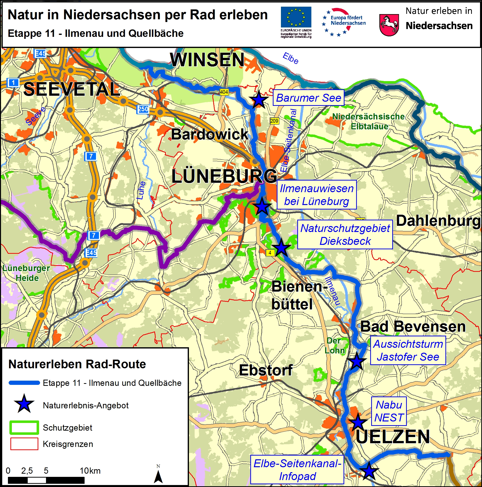 Vom Rand des Uelzener Beckens bei Suhlendorf führt die Naturerleben Rad-Route in die Ilmenau-Niederung und folgt dem Fluss dann Richtung Norden bis zur Mündung der Ilmenau in die Elbe bei Winsen an der Luhe.