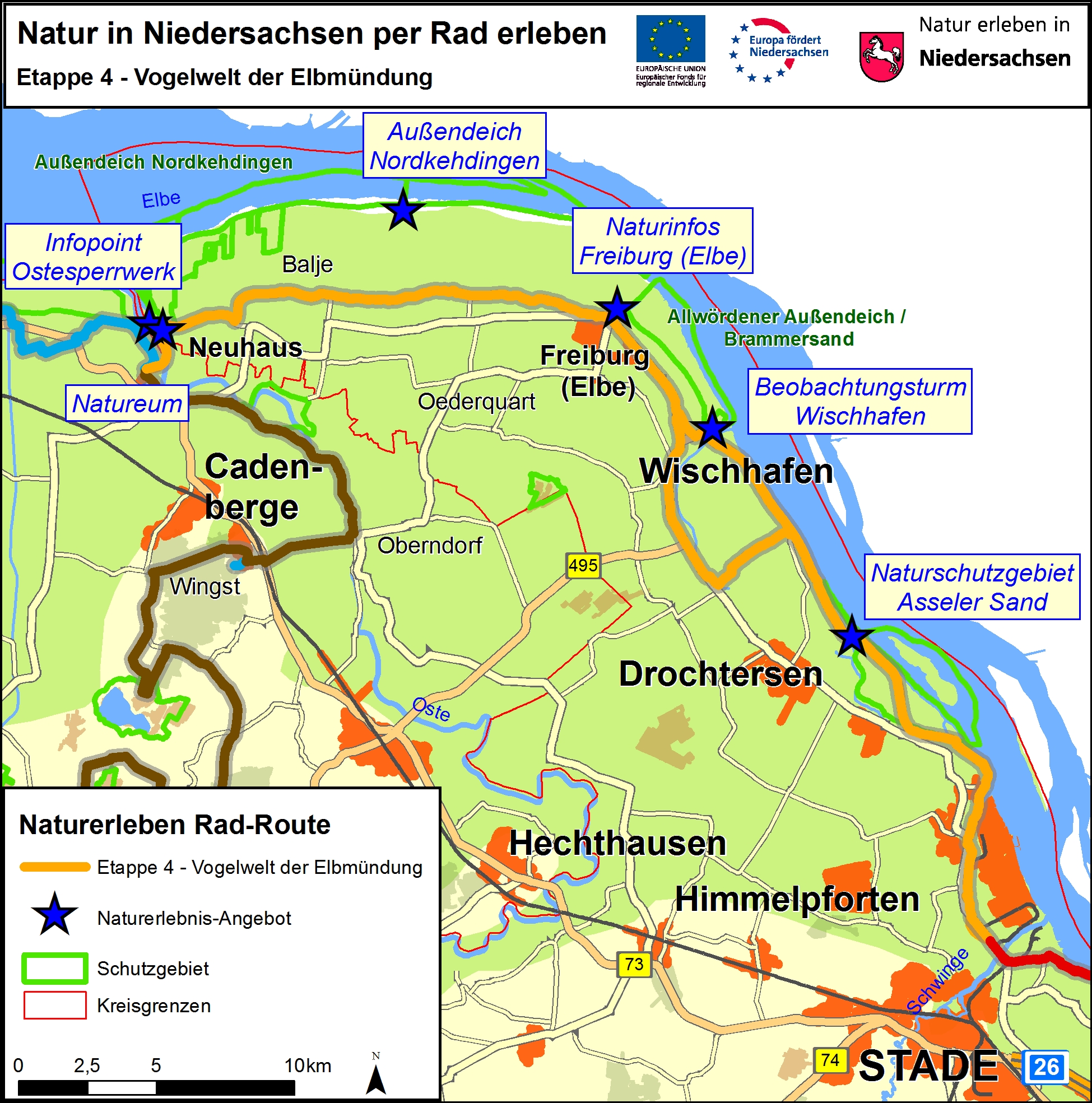 Hinweise zur RouteDie Etappe ist 60 Kilometer lang. Zum überwiegenden Teil deckt sie sich mit dem gut markierten Elberadweg. Der Fernradweg „Vom Teufelsmoor zum Wattenmeer“ und der „North Sea Cycle Route“ werden tangiert.