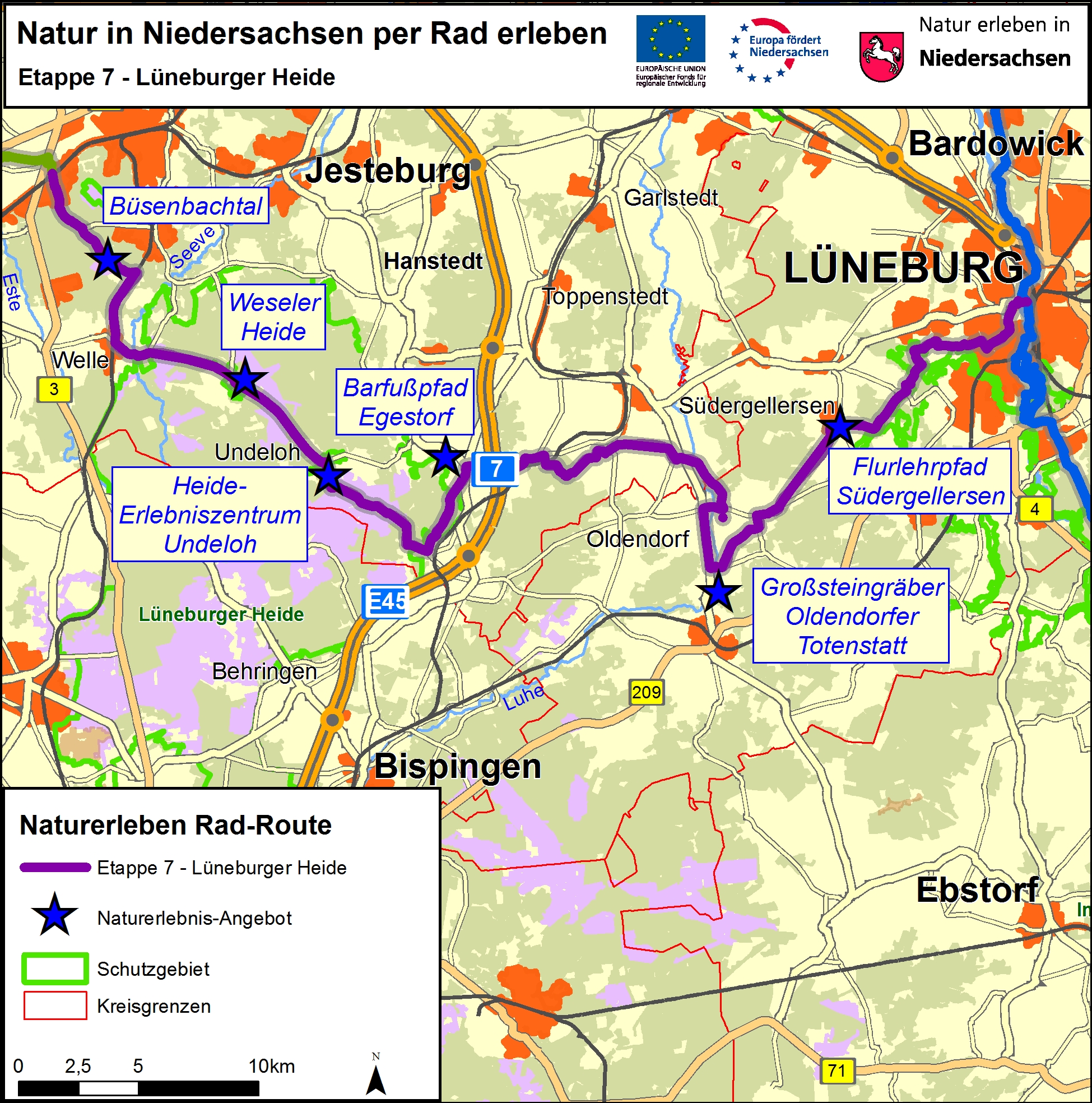 Mit Etappe 7 werden die Elb-Nebenflüsse Este und Ilmenau durch eine landschaftlich reizvolle Route quer durch die Lüneburger Heide verbunden. Von Sprötze bei Buchholz erschließt die Rad-Route die flachwelligen, weiten Heidelandschaften, Mischwaldgebiete und Bachläufe der Lüneburger Heide. Sie verläuft Richtung Westen bis nach Lüneburg, wo sie auf die Etappe 11 „Ilmenau und Quellbäche“ trifft.