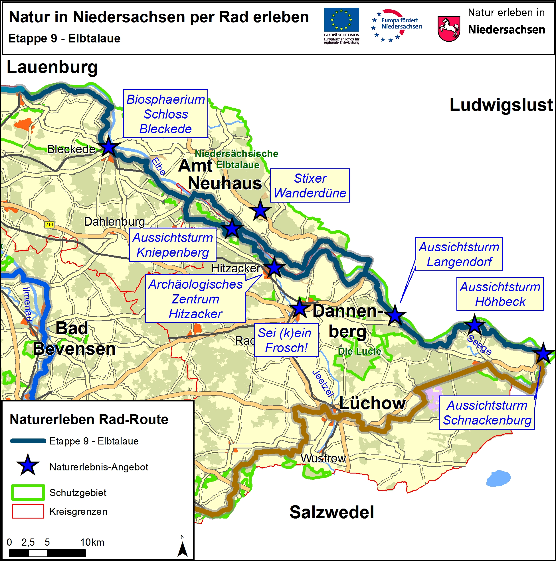 Hinweise zur RouteDie Etappe ist 105 Kilometer lang. Sie quert die Landkreise Lüneburg und Lüchow-Dannenberg.