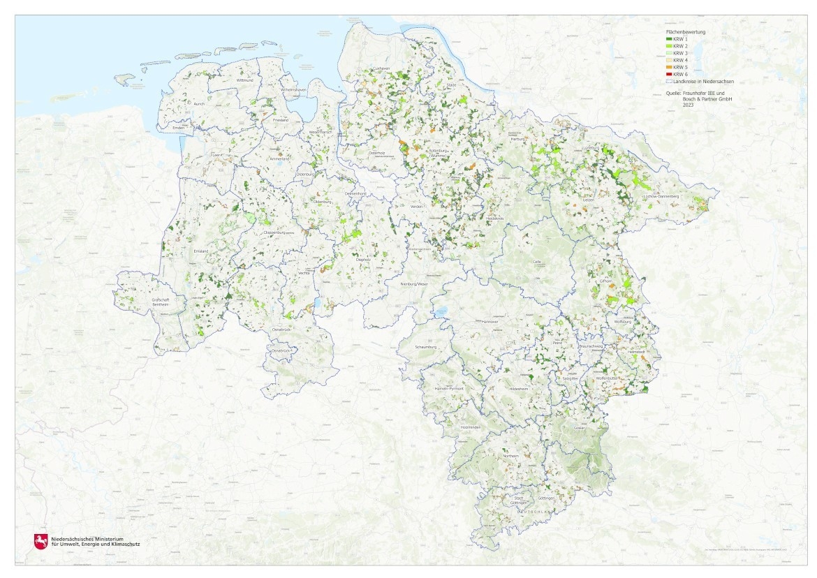 Zu diesem Zweck wurde von dem Niedersächsischen Ministerium für Umwelt, Energie und Klimaschutz eine umfassende landesweite Flächenpotenzialanalyse beauftragt, in der die Flächenpotenziale wissenschaftlich nach einer Vielzahl an objektiven Kriterien wie Besiedlungsdichte, Abständen zur Wohnbebauung, Belangen der Bundeswehr sowie FFH-, Naturschutz- und Vogelschutzgebieten berechnet wurden. Die Träger der Regionalplanung und Kommunalen Spitzenverbände wurden in den Prozess eingebunden – so wurden ihnen Anfang Februar 2023 vorläufige Ergebnisse der Flächenpotenzialanalyse vorgestellt, anschließend bestand Gelegenheit zur Überprüfung und Stellungnahme. Die Hinweise der Planungsträger sind in die weitere Ausgestaltung und Finalisierung der Flächenpotenzialberechnungen eingeflossen. Die finalen Ergebnisse wurden den Trägern der Regionalplanung und Kommunalen Spitzenverbänden am 01.06.2023 vorgestellt.
