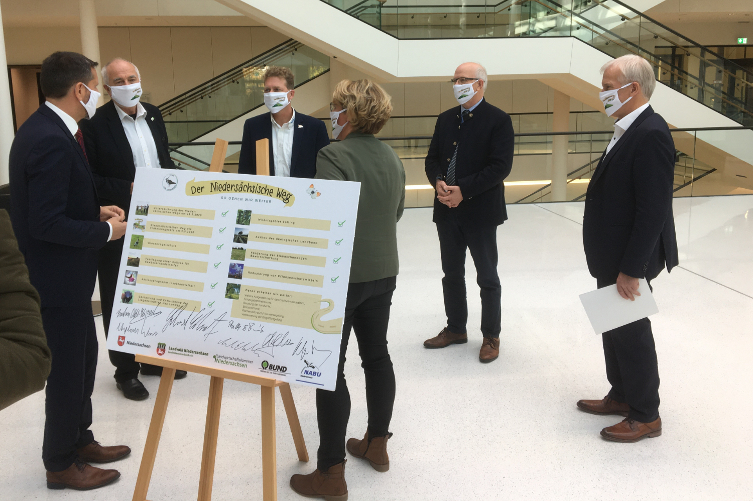 Der Niedersächsische Weg ist eine in dieser Form bundesweit einmalige Vereinbarung zwischen Landwirtschaft, Naturschutz und Politik. Unterzeichner sind Ministerpräsident Stephan Weil, Landwirtschaftsministerin Barbara Otte-Kinast, Umweltminister Olaf Lies, der Präsident des Landvolkes Albert Schulte to Brinke, der Präsident der Landwirtschaftskammer Niedersachsen Gerhard Schwetje, der Vorsitzende des BUND Niedersachsen Heiner Baumgarten und der Vorsitzende des NABU Niedersachsen Dr. Holger Buschmann.