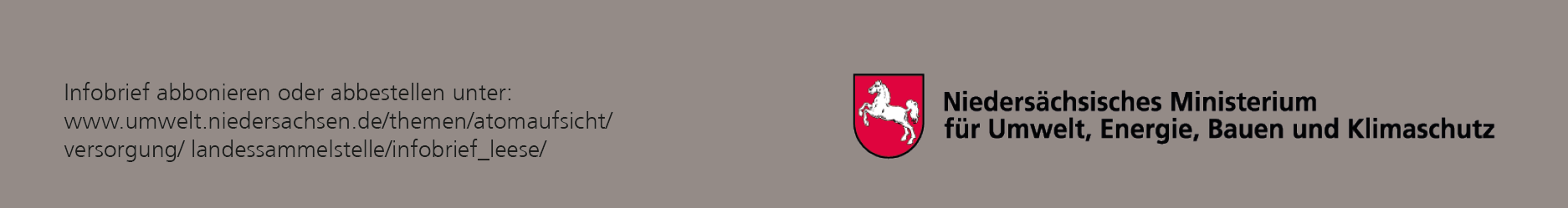 Das Niedersächsische Ministerium für Umwelt, Energie, Bauen und Klimaschutz gibt zu aktuellen Themen, die das Zwischenlager Leese betreffen, in unregelmäßigen Abständen Infobriefe heraus. Die Texte werden sowohl auf unserer Internetseite veröffentlicht als auch per Mail an interessierte Leserinnen und Leser geschickt. Der Infobrief kann auch abonniert werden.