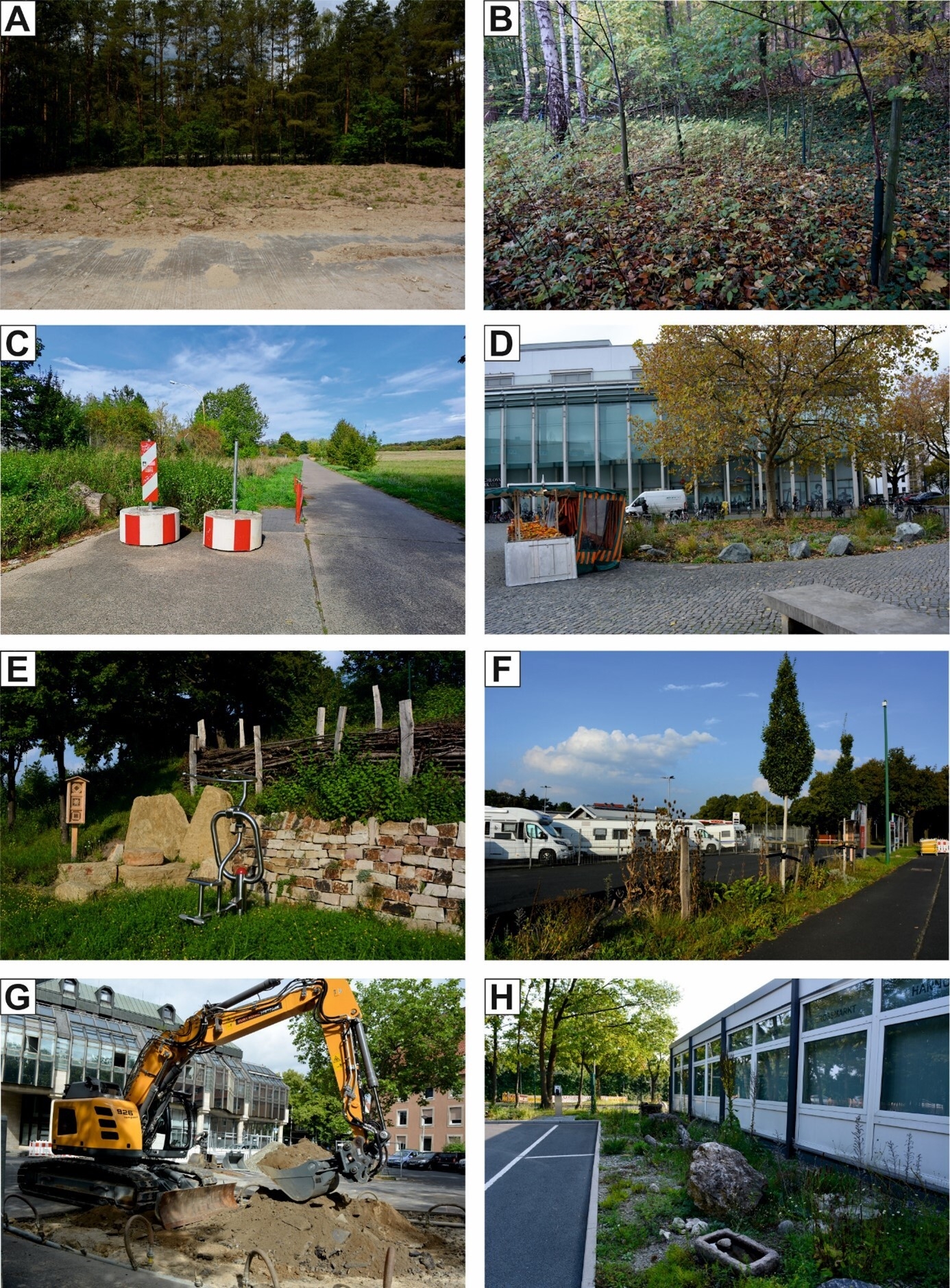 A: Entsiegelung im Bereich eines ehemals militärisch genutzten Gebäudes. B: Entsiegelte Buswendeschleife. C: Teilweise zurückgebaute Panzerstraße. D: Entsiegelung und Anlage eines großzügigen Baumbeets. E: Umgestalteter Randbereich eines Firmengeländes. F: Entsiegelung und Begrünung im Verkehrsraum. G: Entsiegelung einer innerstädtischen Parkfläche. H: Umgestaltung eines Schottergartens im Bereich einer Gewerbefläche zugunsten einer naturnahen und pflegearmen Grünfläche.