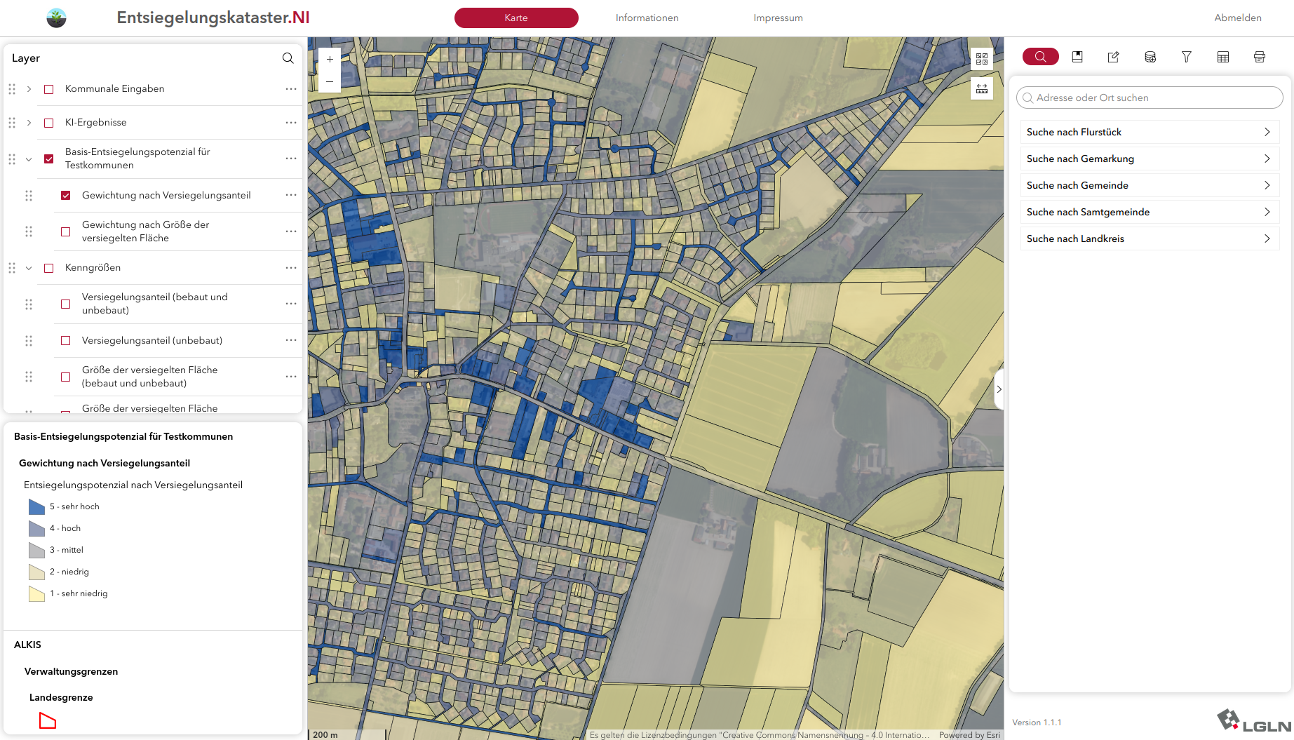 Es ist eine öffentliche Version des Entsiegelungskatasters in Vorbereitung. Diese beinhaltet keine gemeindespezifischen Informationen, ermöglicht aber die Sicht auf niedersachsenweite Daten, wie die KI-detektierten versiegelten Flächen, die niedersachsenweit berechneten flurstücksbezogenen Entsiegelungspotenziale und Kenngrößen. Auch grundlegende GIS Funktionen, z.B. Filter, sind dort vorhanden.