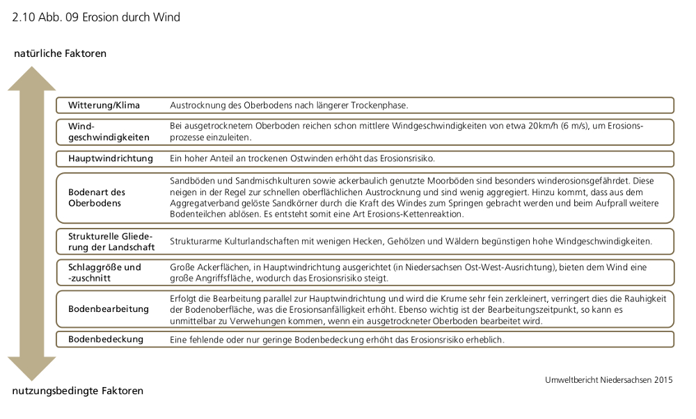 Winderosion wird verursacht durch das Vorhandensein strukturarmer, offener Landschaften sowie einer nicht oder nur gering ausgeprägten Vegetationsdecke. Die Bodenart des obersten Mineralbodenhorizonts spielt dabei ebenfalls eine entscheidende Rolle, so sind in Niedersachsen vor allem die leichten und trockenen Sandböden der Geestlandschaften und die ackerbaulich genutzten Moorböden winderosionsgefährdet.