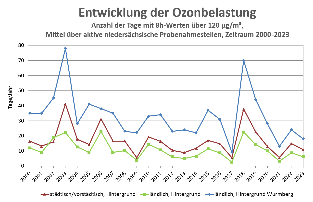 Eine Sonderrolle nimmt die Messstation Wurmberg ein. Aufgrund ihrer Höhenlage befindet sie sich häufig in der sogenannten Ozon-Reservoirschicht und weist daher die höchste mittlere Ozonbelastung in Niedersachsen auf.
