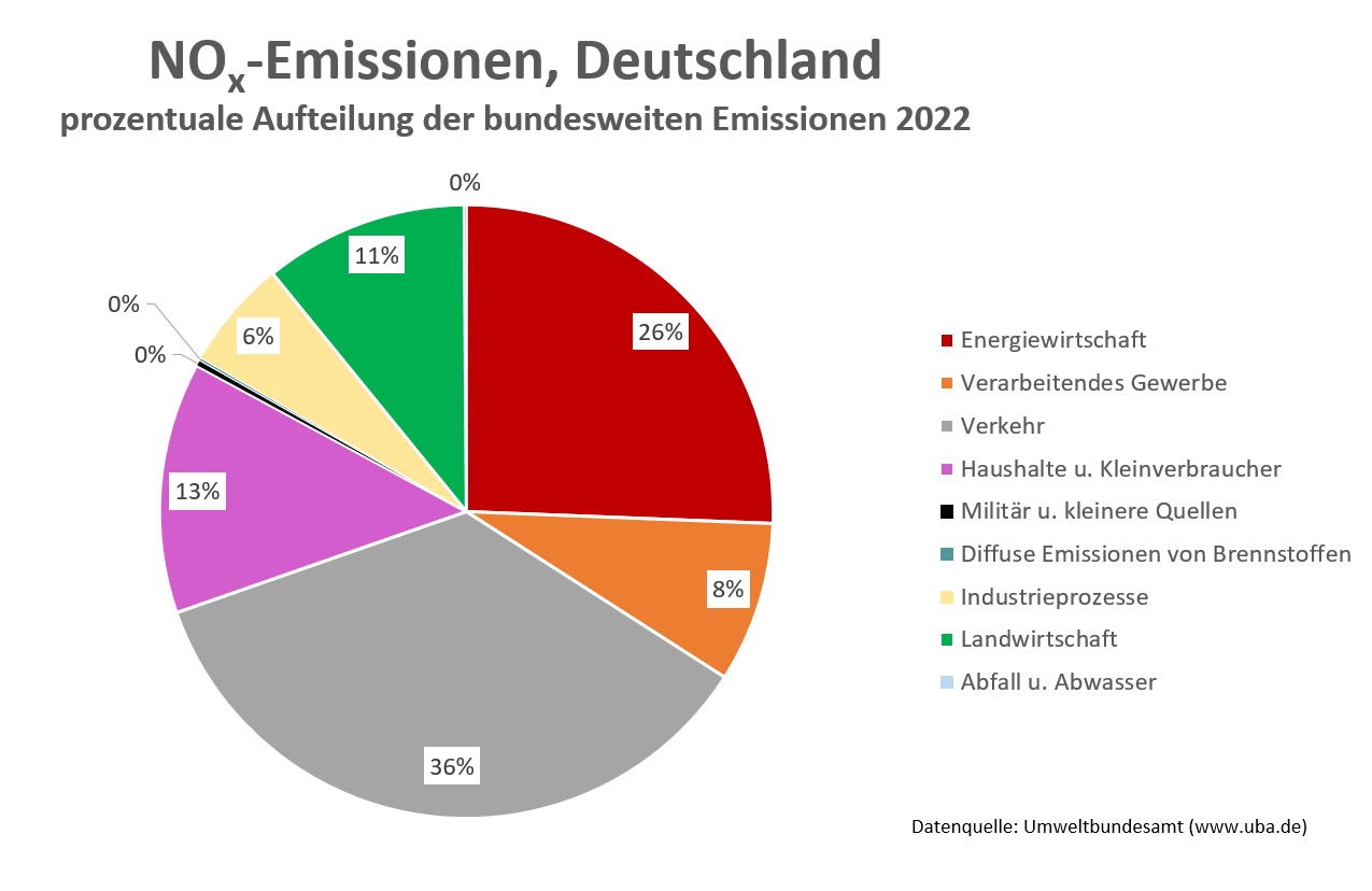 Die bundesweit derzeit (2022) relevanteste Quelle für Stickstoffoxide ist der Kfz-Verkehr (36 %), gefolgt von der Energiewirtschaft (26 %). Die restlichen Quellgruppen spielen eine eher untergeordnete Rolle.
