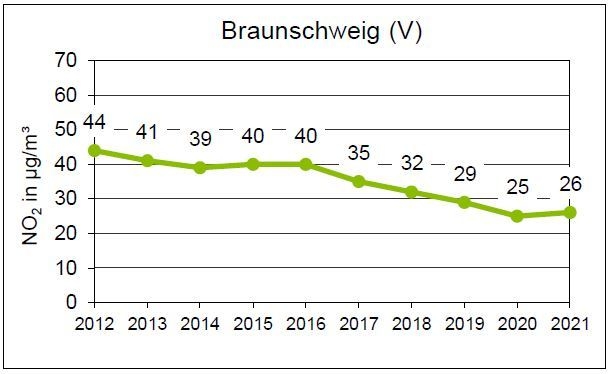 Die sich in den letzten Jahren abzeichnende NO2-Verminderung hält weiter an. Während im Jahr 2010 an der Verkehrsmessstation am Altewiekring eine NO2-Immission von 51 µg/m³ gemessen wurde, konnte bereits im Jahr 2014 mit 39 µg/m³ erstmals eine Einhaltung des Jahresgrenzwert von 40 µg/m³ messtechnisch festgestellt werden. Am Bohlweg wurde der Jahresgrenzwert für NO2 erstmals im Jahr 2016 mit 39 µg/m³ eingehalten. Bis zum Abbau der Station zum Ende des Jahres 2019 hat sich die NO2-Konzentration am Bohlweg kontinuierlich und deutlich auf 31 µg/m³ verringert. Auch am Altewiekring sank die NO2-Konzentration kontinuierlich und deutlich auf 26 µg/m³ im Jahr 2021.