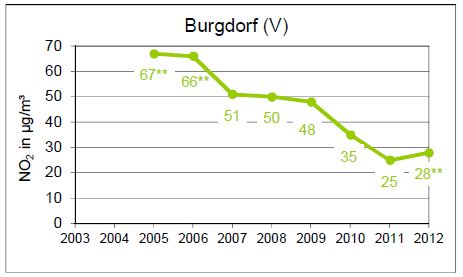 Während im Jahre 2009 an der Verkehrsmessstation in Burgdorf eine NO2-Immission von 48 µg/m³ gemessen wurde, konnte im Jahr 2010 mit 35 µg/m³ erstmals eine Einhaltung des Jahresgrenzwert von 40 µg/m³ messtechnisch festgestellt werden. Bis zum Abbau der Station im Jahr 2012 sank die NO2-Konzentration an diesem Standort kontinuierlich und deutlich bis auf 25 µg/m³ im Jahr 2011 ab.