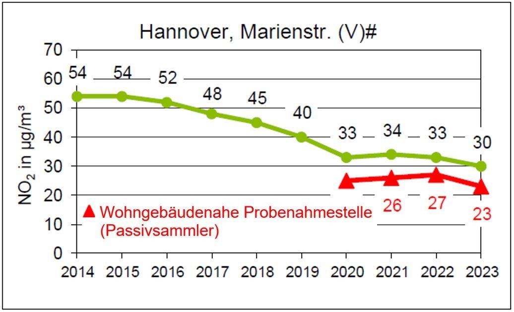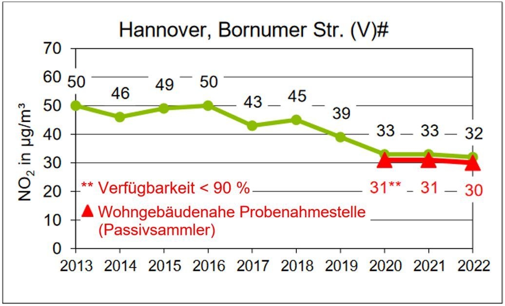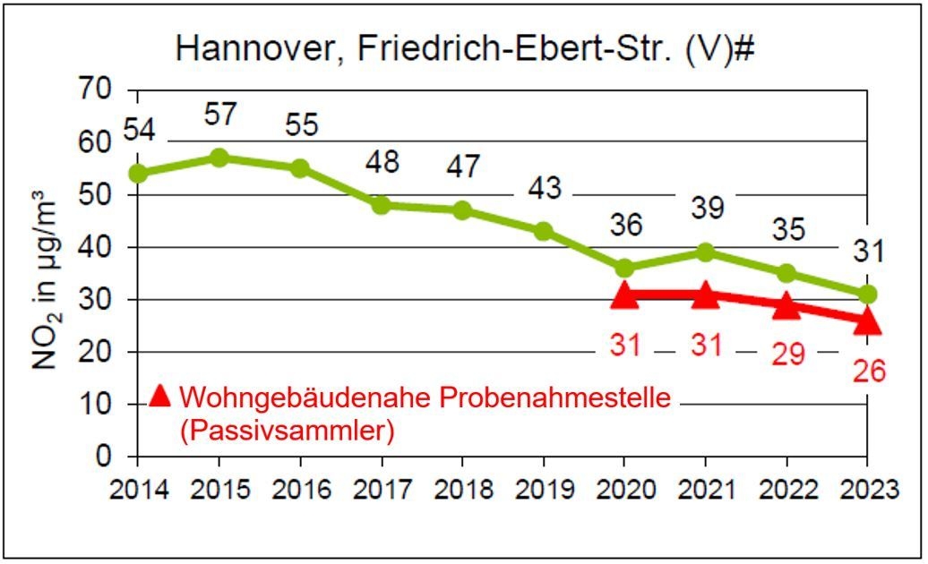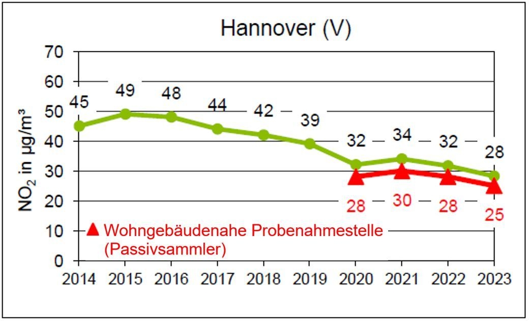 In Hannover wird seit 2010 die NO2-Immission zusätzlich zur Verkehrsstation an weiteren Standorten verkehrsnah mittels Passivsammler bestimmt. Auch im Jahr 2015 konnte trotz der im Luftqualitätsplan enthaltenden Maßnahmen der NO2-Jahresgrenzwert an mehreren Hauptverkehrsstraßen nicht eingehalten werden. Folglich wurden weitere Maßnahmen beschlossen, die unabhängig vom Luftqualitätsplan umgesetzt wurden. Seit dem Jahr 2017 wurde an allen Stationen eine kontinuierlich sinkende NO2-Konzentration gemessen. 2020 konnte erstmals an allen Verkehrsmessstation eine Einhaltung des Jahresgrenzwertes von 40 µg/m3 messtechnisch festgestellt werden. Zusätzlich installierte wohngebäudenahe Messungen bestätigten seit 2020 mit NO2-Konzentrationen unterhalb der straßennahen Messungen messtechnisch die Einhaltung des Jahresgrenzwertes von 40 µg/m³ an der Baufluchtlinie. Aufgrund der verbesserten Luftgütesituation überarbeitete die Stadt Hannover ihren Luftreinhalteplan mit der Fortschreibung 2023.