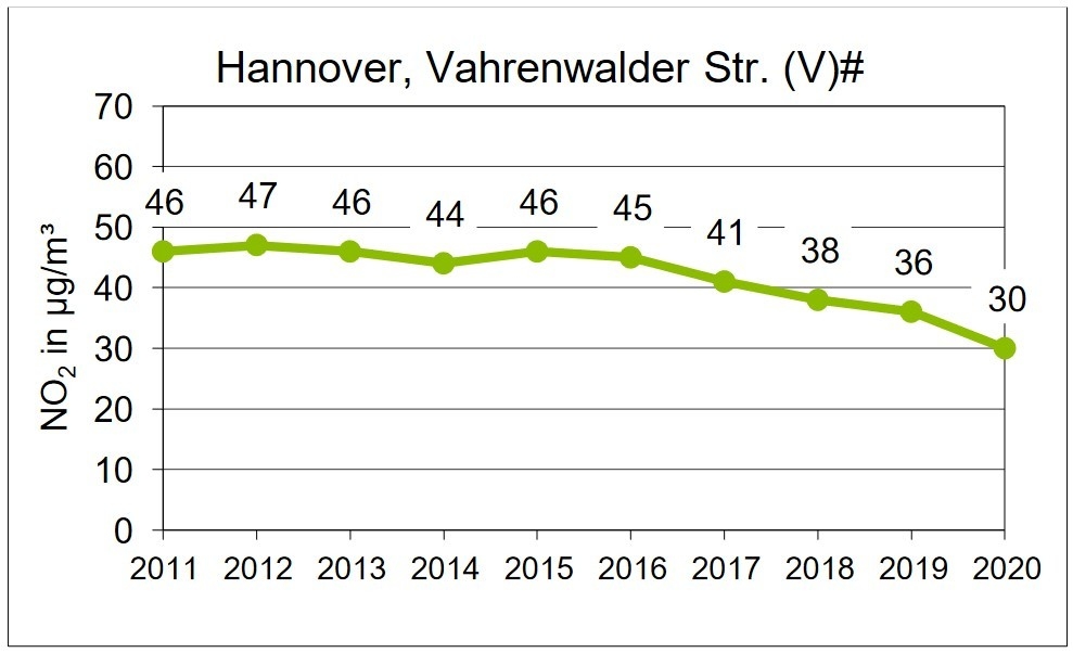 In Hannover hat die Luftschadstoffbelastung seit Jahren einen abnehmenden Trend gezeigt. Durch fortschreitende Modernisierung der Fahrzeugflotte und kommunale Maßnahmen konnten positive Effekte im Hinblick auf die Luftqualität erzielt werden. Die Grenzwerte für Stickstoffdioxid (NO2) und Partikel (PM10 und PM2,5) wurden in den letzten Jahren an allen Probenahmestellen eingehalten.