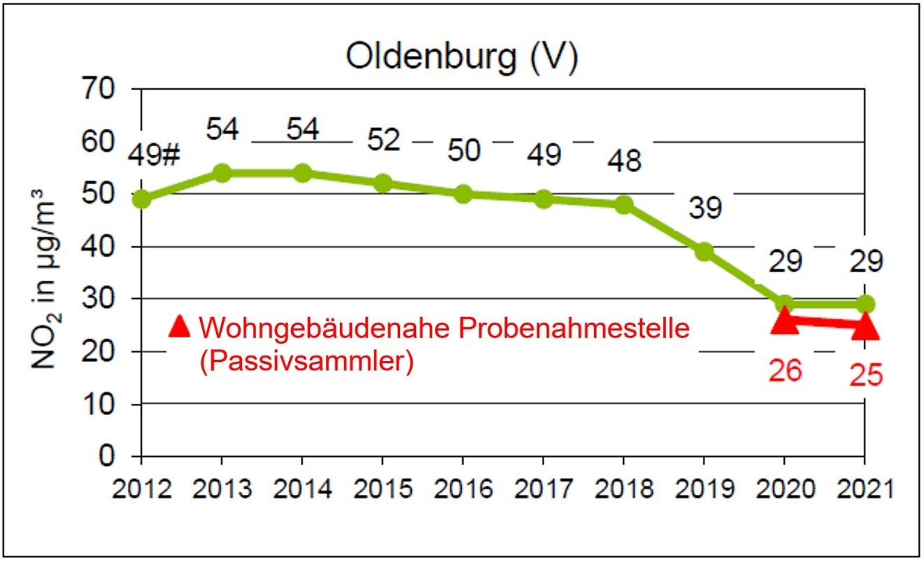 Die NO2-Immission wurde in Oldenburg im Heiligengeistwall zunächst mittels Passivsammler und seit 2013 mit einer kontinuierlich messenden Verkehrsstation überwacht. Die sich in den letzten Jahren abzeichnende NO2-Verminderung hält weiter an. Während im Jahre 2015 eine NO2-Immission von 52 µg/m³ gemessen wurde, konnte 2019 mit 39 µg/m³ erstmals eine Einhaltung des Jahresgrenzwert von 40 µg/m³ messtechnisch festgestellt werden. Bis zum Jahr 2021 hat sich die NO2-Konzentration nochmals deutlich auf 29 µg/m³ verringert.