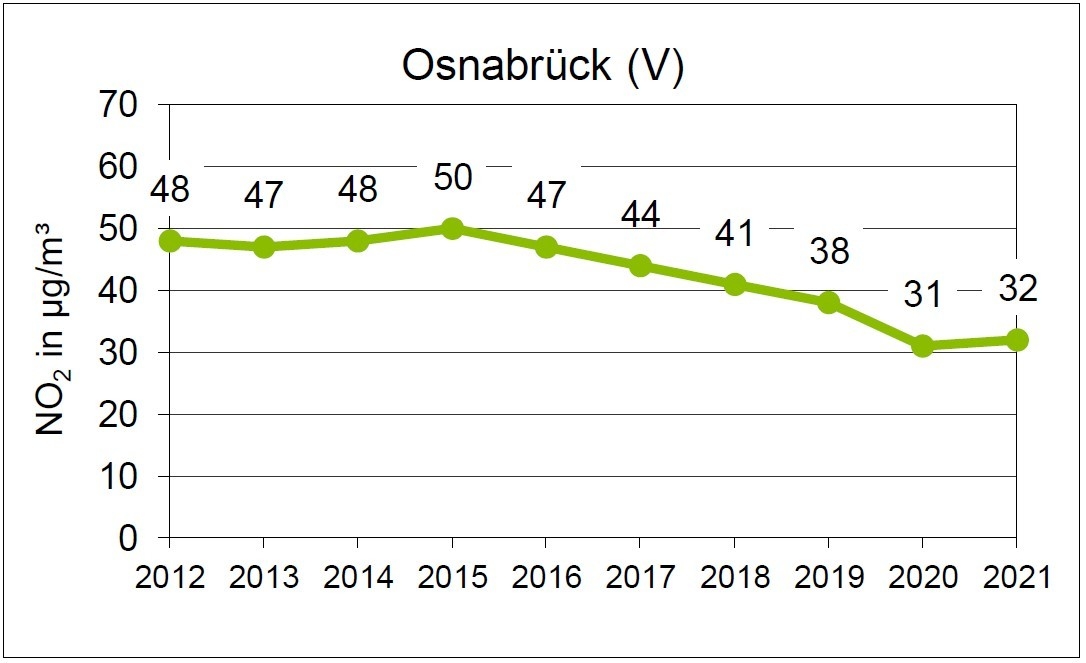 In der Stadt Osnabrück wurden im Jahr 2010 immer noch NO2-Jahresmittelwerte über dem Grenzwert von 40 µg/m³ registriert. Für das Stadtgebiet von Osnabrück wurde durch das GAA Hildesheim der Bericht „Modellgestützte Voruntersuchung zur Fortschreibung des Luftreinhalteplanes im Rahmen der NO2-Notifizierung - Osnabrück –“ erstellt. Er diente u.a. auch zur Ermittlung der Luftschadstoffbelastungen im Hauptstraßennetz für das Bezugsjahr 2010 unter Berücksichtigung der 1. Stufe der Umweltzone. Für den im Jahr 2010 geltenden Grenzwert für PM10 von 40 µg/m³ wurde im Stadtgebiet Osnabrück mit PM10-Jahresmittelwerten bis zu 29 µg/m³ nur eine geringe Wahrscheinlichkeit für eine Überschreitung ermittelt. Zwei Abschnitte in der Lotter Straße und der Martinistraße mit PM10-Jahresmittelwerten von 29 µg/m³ wiesen mit einer geringen Wahrscheinlichkeit auf die Überschreitung des Tagesgrenzwertkriteriums hin. Die Berechnung des NO2-Jahresmittelwertes ergab für mehrere Straßenabschnitte Überschreitungen des Grenzwertes.