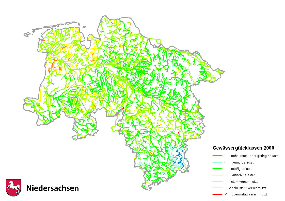 Bisher wurde die Güte der Oberflächengewässer in Deutschland (und in Niedersachsen) in biologischer Hinsicht aufgrund des Sauerstoffgehaltes beurteilt und dargestellt. Als Indikatoren des Gewässerzustandes wurden Organismen benutzt, die für die jeweilige Belastungsstufe realistisch sind (so genannter Saprobienindex). Die zuletzt veröffentlichte Gewässergütekarte 2000 zeigt hiernach für Niedersachsen ein zufriedenstellendes Bild. (Die Saprobie ist als erste wichtige Basiskomponente der Beurteilung in die Bestandsaufnahme der Oberflächengewässer gemäß Wasserrahmenrichtlinie eingeflossen).