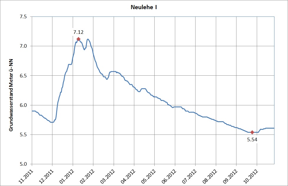 Der zeitliche Verlauf des Grundwasserstandes an einer Messstelle wird üblicherweise durch eine sich über mehrere Jahre erstreckende Ganglinie wiedergegeben (Abbildung 1). Ganglinien zeigen typische Strukturen, die auf den Witterungsablauf im Jahresgang, aber auch auf geologische, hydrologische und menschliche Faktoren (Entnahmen, bauliche Maßnahmen, etc.) zurückgeführt werden können. Abbildung 2 zeigt die Grundwasserstandsentwicklung im Jahreslauf mittels einer Jahresganglinie. Über die Wintermonate steigt der Grundwasserstand in Abhängigkeit von der erhöhten Grundwasserneubildung an, um in den Sommermonaten - in der Regel bis September/Oktober – wieder abzufallen. Danach steigt der Grundwasserstand mit der wieder einsetzenden Grundwasserneubildung wieder an.