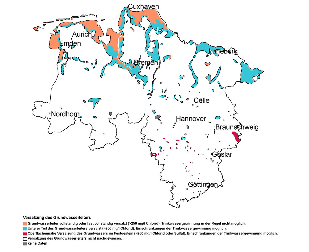 Doch auch der physikalische Aufbau und die chemische Zusammensetzung der Grundwasserleiter selbst bestimmen und beeinflussen die natürliche Beschaffenheit des in ihnen strömenden Grundwassers. Dieser daraus resultierende sogenannte geogene Hintergrundwert kann bereits Einschränkungen bei der Nutzung von Grundwasser zur Folge haben. In Buntsandsteingebieten können zum Beispiel hohe Arsen- und Urangehalte natürlichen Ursprungs auftreten, im Bereich von aufsteigenden Tiefenwässern, im Umfeld von Salzstöcken und entlang der Küste kann das Grundwasser einen erhöhten Salzgehalt aufweisen. Die Grundwasserversalzungist in Niedersachsen der bedeutendste natürliche Faktor für eine Nutzungseinschränkung (siehe auch Abbildung 7).