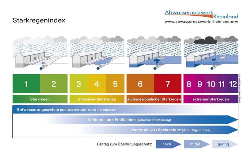 Der Starkregenindex (zwölfstufig) stellt einen allgemeinverständlichen Ansatz in der Risikokommunikation zur Vermittlung des Charakters von Starkregen dar. Er soll die Bewertung von Starkregenereignissen über die Intensität des Niederschlages vereinfachen und verständlicher darstellen. Dafür wurden Regenereignisse in 12 Stufen, sogenannte Starkregenindizes zwischen 1 und 12, eingeteilt. Während der Index 1 einen „normalen“ Starkregen beschreibt, der in den Sommermonaten häufiger fällt, beschreibt der Index 12 einen extremen Starkregen, der sehr selten fällt. Mit diesen Indizes ist der Starkregenindex mit der bekannten Richterskala zur Messung der Stärke von Erdbeben oder der Beaufortskala zur Klassifikation der Windstärken vergleichbar.
