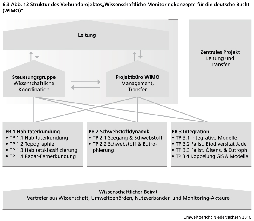 Niedersachsen möchte im Rahmen seiner Nachhaltigkeitsstrategie die Meeresforschung stärken und damit dazu beitragen, dass die bisher vorliegenden Kenntnisse über die deutsche Nordsee wesentlich verbessert werden. Damit sollen seitens der Wissenschaft die erforderlichen Grundlagen bereitgestellt werden, die man künftig benötigt. Dies betrifft insbesondere die Erweiterung der Kenntnisse über ständig vom Wasser bedeckte Wasserflächen, das sogenannte Sublitoral, das nach wie vor als „terra incognita“ beschrieben werden kann. Im Rahmen der niedersächsischen Forschungsförderung wurde daher ein Mehrjahresprogramm zur Nordseeforschung („Wissenschaftliche Monitoringkonzepte für die Deutsche Bucht - WIMO“) aufgelegt, dessen Ziel es ist, die bestehenden Wissensdefizite zu beseitigen, eine Beschreibung und Bewertung von Zustand und Entwicklung der deutschen Nordsee zu ermöglichen und weitere Werkzeuge/Instrumente zu entwickeln, um entsprechend wissenschaftlich fundierte Informationen auch für die Öffentlichkeit bereitzustellen. Zahlreiche in Norddeutschland ansässige Meeresforschungseinrichtungen sind daran beteiligt. Das Vorhaben ist gleichzeitig Bestandteil des niedersächsischen Maßnahmenprogramms zur Umsetzung der EG-Wasserrahmenrichtlinie (Abb. 13).