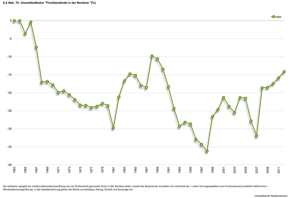 Der Umweltindikator „Fischbestände in der Nordsee“ ist einer der niedersächsischen Kernindikatoren, die im Auftrag des Umweltministeriums vom damaligen Niedersächsischen Landesamt für Ökologie erarbeitet wurden (NLÖ 2004). Der Indikator spiegelt die mittlere Bestandsentwicklung von vier fischereilich genutzten Arten in der Nordsee wider, soweit der Bestand der einzelnen Art unterhalb der – unter Vorsorgeaspekten von Fischereiwissenschaftlern definierten – Mindestbestandsgröße lag.