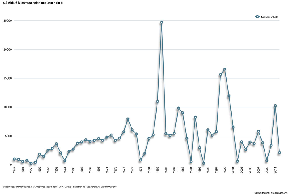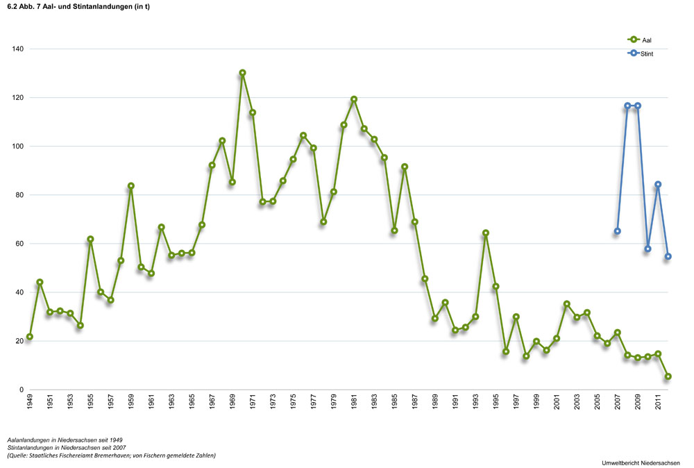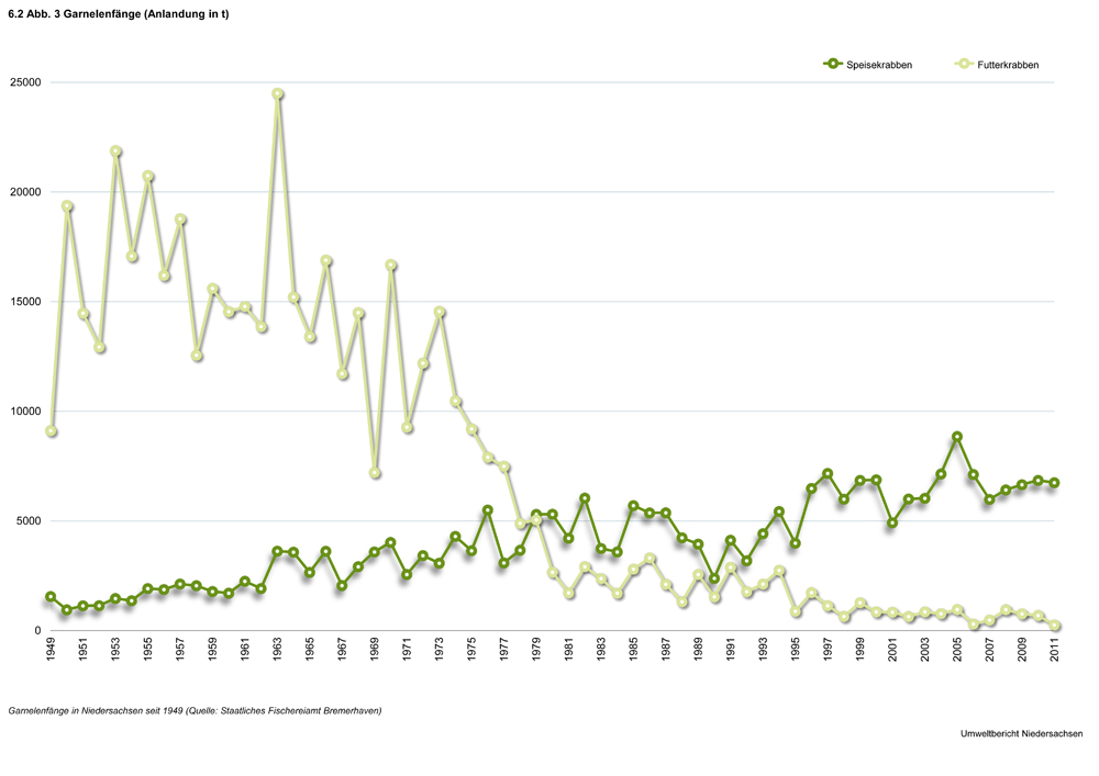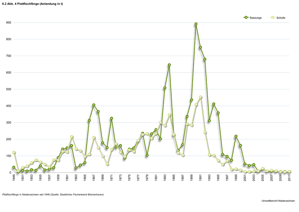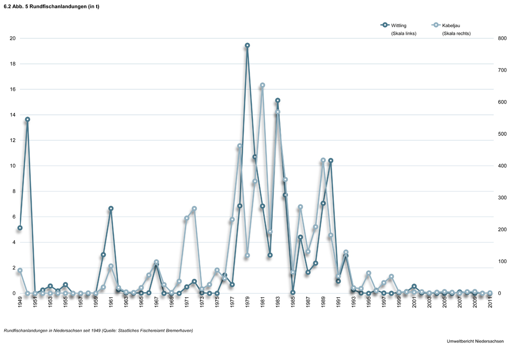 Bis in die 90er Jahre war vor der niedersächsischen Küste während der Wintermonate eine erfolgreiche Kabeljaubefischung mit Grundschleppnetzen möglich. Durch den starken Rückgang dieser Bestände seit dieser Zeit, der sehr wahrscheinlich klimatisch bedingt ist, ist diese Fischerei völlig zum Erliegen gekommen (Abb. 5).