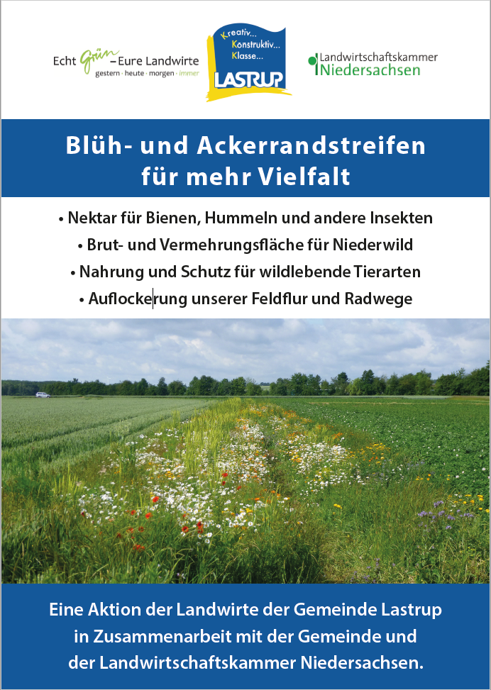 In einem ersten Schritt wurden auf Initiative der Gemeinde Lastrup und in Kooperation mit örtlichen Landwirten und der Landwirtschaftskammer 19 ha Blühstreifen angelegt. Insgesamt haben in diesem Jahr 56 Landwirte an Acker- und Gewässerrändern Blühstreifen entwickelt. Die Gemeinde hat sich hier ebenfalls mit gemeindeeigenen Flächen eingebracht. Mit Hilfe eines einfachen Formulars konnten sich die Flächeneigentümer für eine Teilnahme bei der Gemeinde bewerben. Die Kosten für das Projekt in Höhe von 6.650 € wurden von der Gemeinde Lastrup getragen. Mit Hinweisschildern, die das Blühprojekt kurz beschreiben und die auf den Blühstreifen von den Landwirten aufgestellt werden, wird das Projekt öffentlichkeitswirksam beworben. Der direkte Austausch zwischen Bürgermeister, Verwaltungsmitarbeitern und interessierten/ teilnehmenden Landwirten in der ländlichen Gemeinde Lastrup befördert das Projekt.
