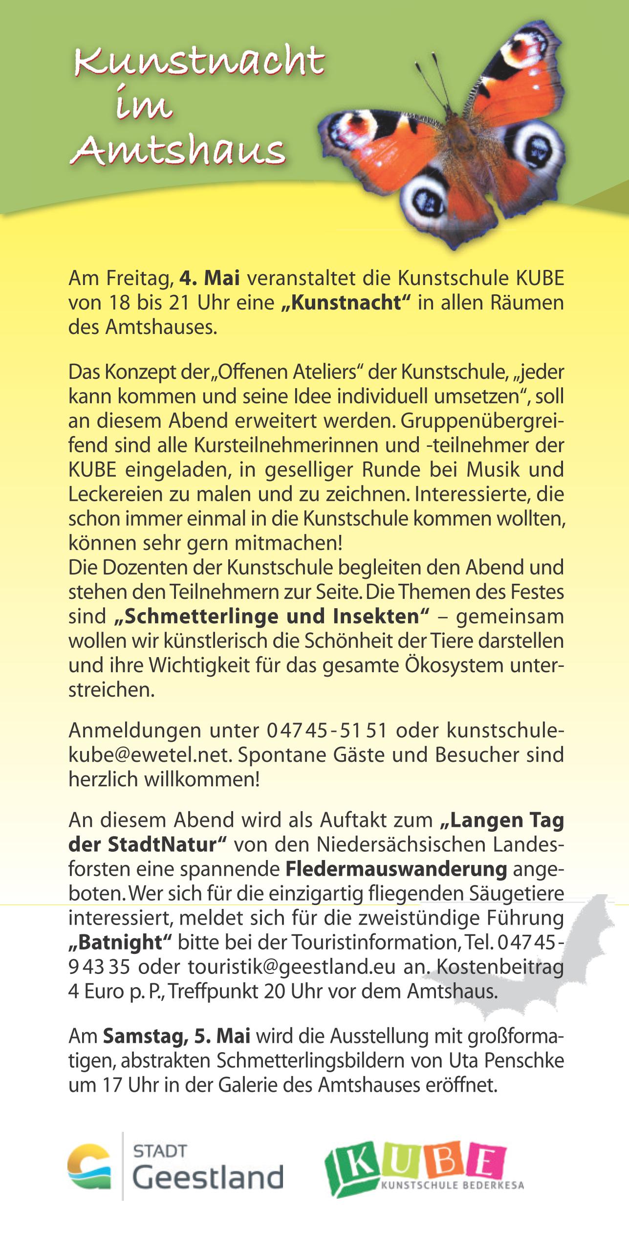 Unter diesem Motto verfolgt die Stadt Geestland verschiedene Projekte: Rabatten innerorts wurden insektenfreundlich umgestaltet. Neu angelegte Wegeränder sollen mit einer geeigneten Saatmischung angesät werden. Erste Ortsteile haben bereits Interesse bekundet Wegraine mit Unterstützung der Landwirtschaft zu verbessern. In Zusammenarbeit u.a mit Jägern und Landwirten soll sukkzessiv eine Biotopvernetzung hergestellt werden. Als Auftaktveranstaltung wurde ein ,,Langer Tag der StadtNatur durchgeführt, vorgeschaltete war ein Kunstnacht im Amtshaus.