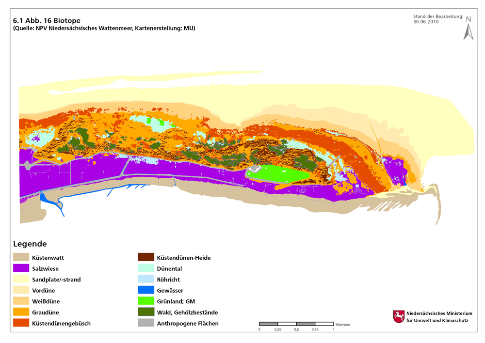 [Abb. 16 Vegetationskartierung am Beispiel des Ostendes Langeoogs für die terrestrischen Bereiche des Nationalparks Niedersächsisches Wattenmeer, FFH-Lebensraum- und TMAP-Typen, Auswertung digitaler Luftbilder sowie Kartierarbeit im Gelände 2004. (Quelle: Nationalparkverwaltung Niedersächsisches Wattenmeer, Kartenerstellung: MU)]