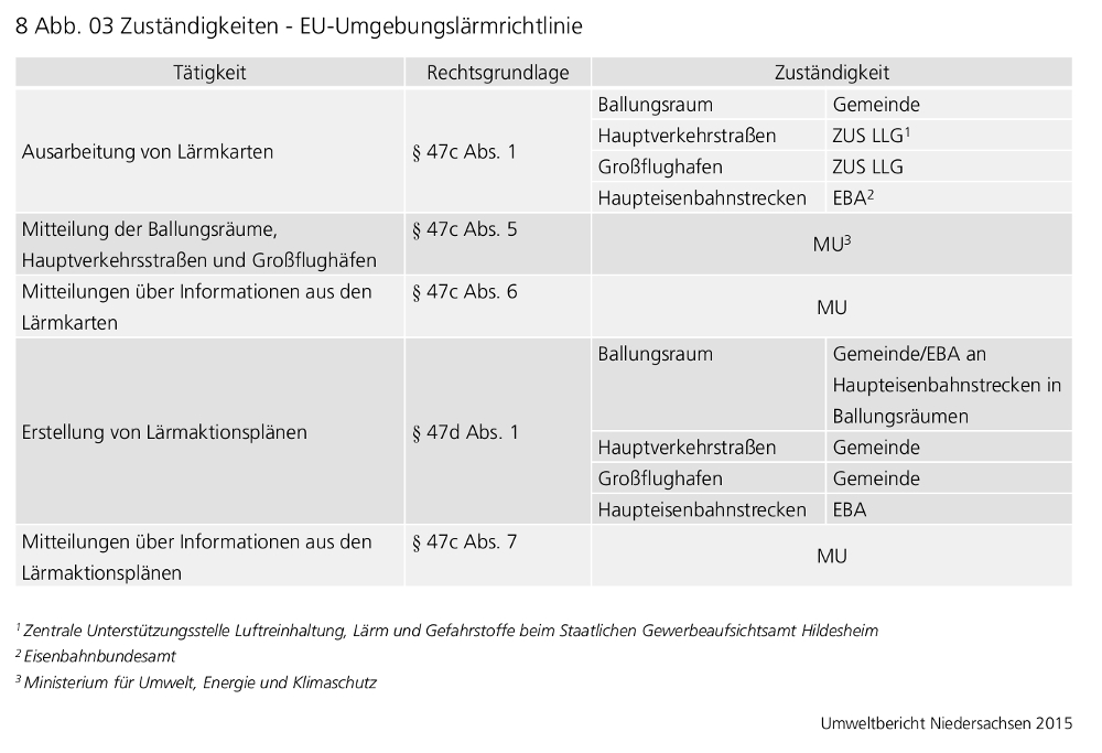 In Niedersachsen wurde das Hauptverkehrsstraßennetz, der Großflughafen Hannover-Langenhagen sowie die Ballungsräume Hannover, Oldenburg, Osnabrück, Braunschweig, Hildesheim und Göttingen kartiert. Das Haupteisenbahnstreckennetz wurde durch das Eisenbahnbundesamt kartiert. Die bestehenden Zuständigkeitsregelungen können Sie aus folgender Grafik entnehmen (Abb. 03).